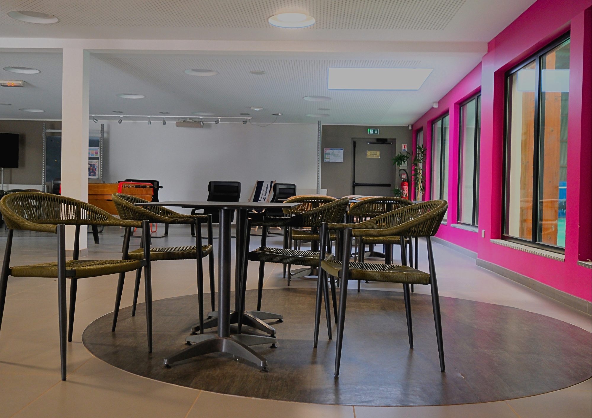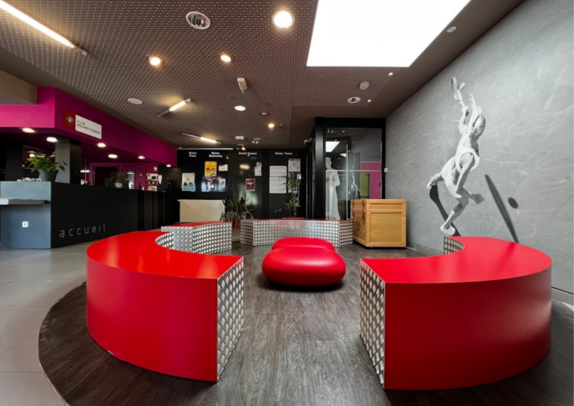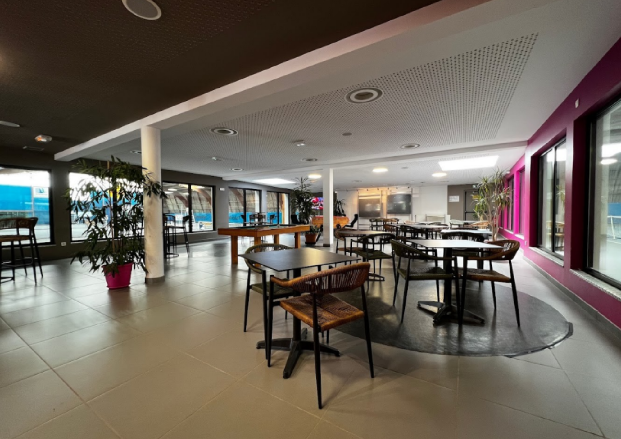 Un club-house convivial avec bar et restauration rapide, une salle gymnique pour fitness, pilates, danse et yoga, des vestiaires hommes/femmes avec douches et casiers sécurisés, un espace accueil chaleureux, une grande salle avec TV, jeux pour enfants et ados, billard, possibilité cordage raquette...